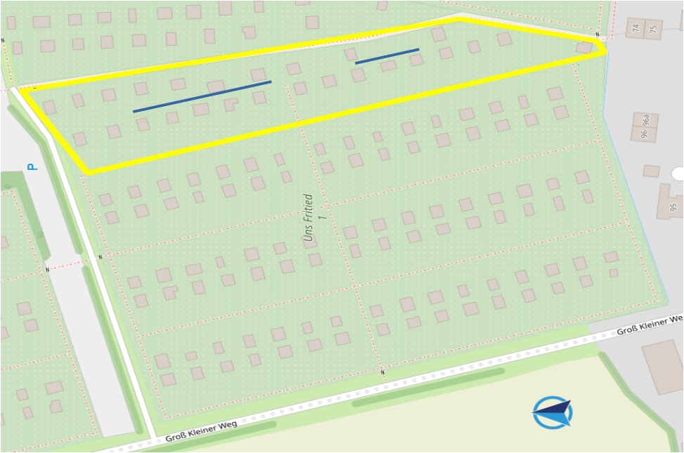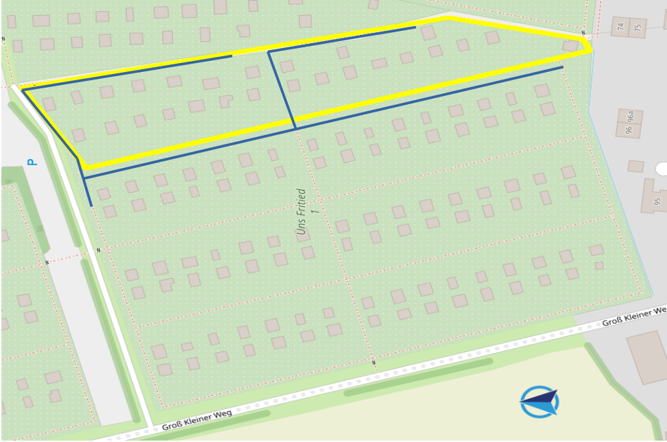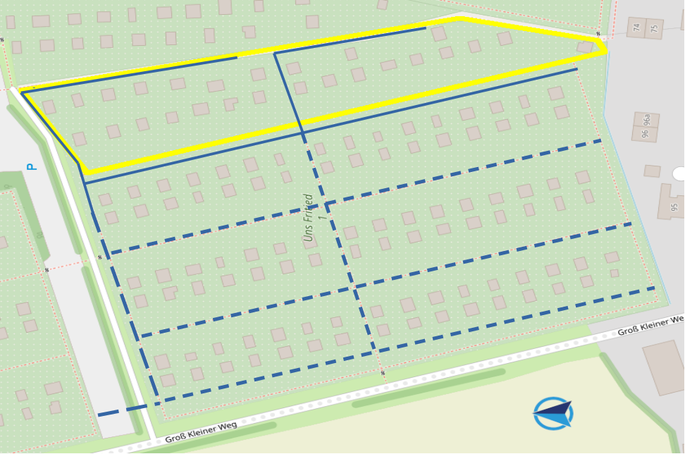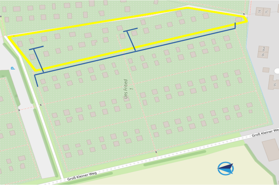 Hierzu lag bereits ein Vorschlag eines AG-Mitglieds vor, der bei der gemeinsamen Objektbegehung der AG WASSER am 17.11.2024 wieder aufgegriffen wurde. Der Vorschlag sieht vor, grundsätzlich neue Hauptstränge über die Hauptwege der Kleingartenanlage zu verlegen. Im Ergebnis wird von der Arbeitsgruppe folgender Verlauf der Hauptwasserleitung favorisiert: