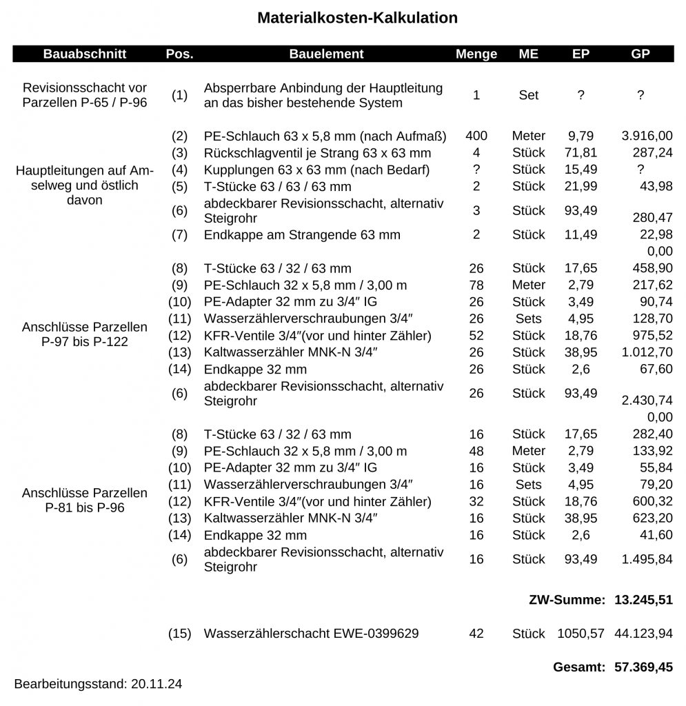 Aus der bisher vorgesehenen Ausführung (PE-Leitungen verschraubt, o.a. Materialpreise) ergeben sich folgende Materialkosten: